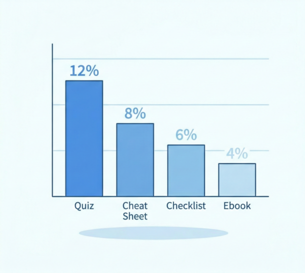 Ebooks convert at around 24% according to Leadpages data, which places them below quizzes (40.1%), cheat sheets (roughly 34%), and checklists (roughly 27%). However, raw conversion rate is only part of the picture. Ebooks tend to attract more qualified, research-oriented leads and are better suited to building authority in depth. Template kits and checklists win on opt-in volume for cold traffic; ebooks can win on lead quality and downstream conversion when built around a specific, original insight.