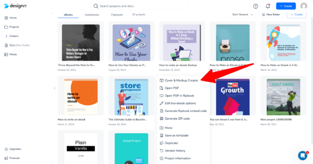 Second, Designrr stores version history. This makes it easy to go back to a previous design if you really mess things up (though it’s so simple, we’re pretty sure you won’t.) To find this, go to your dashboard, and check out the project menu where it says restore.